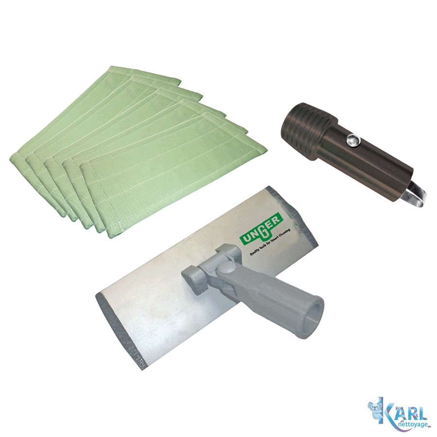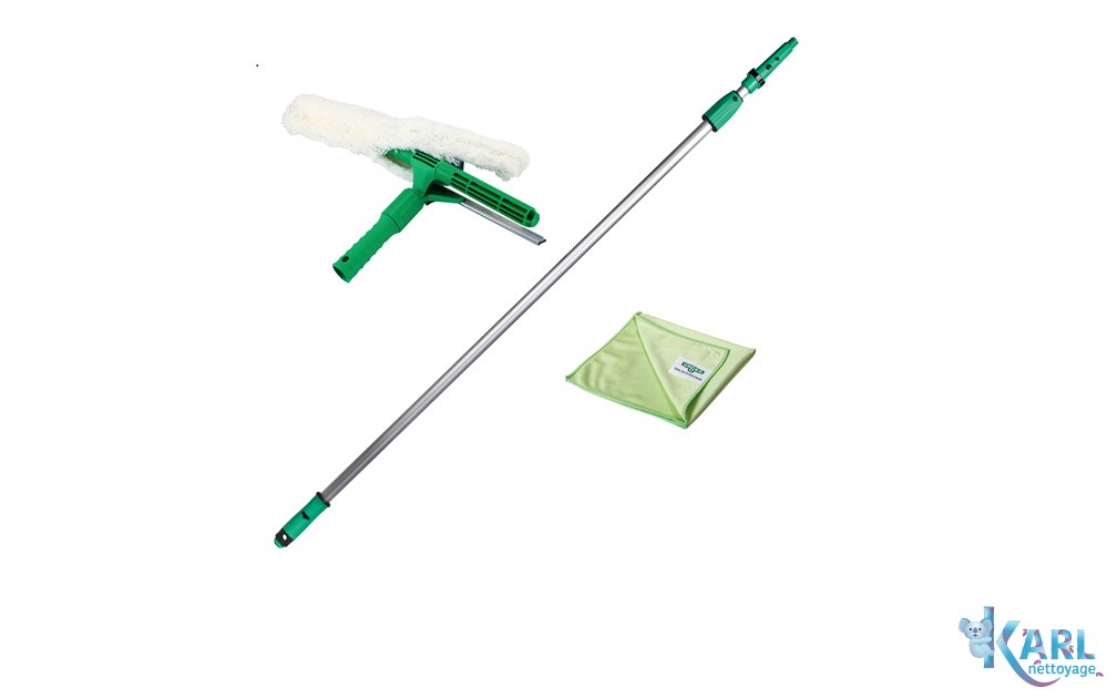 Kit de démarrage pour le nettoyage avec perche télescopique. Constitue un équipement de base idéal pour le nettoyage des vitres et des vérandas avec une perche télescopique